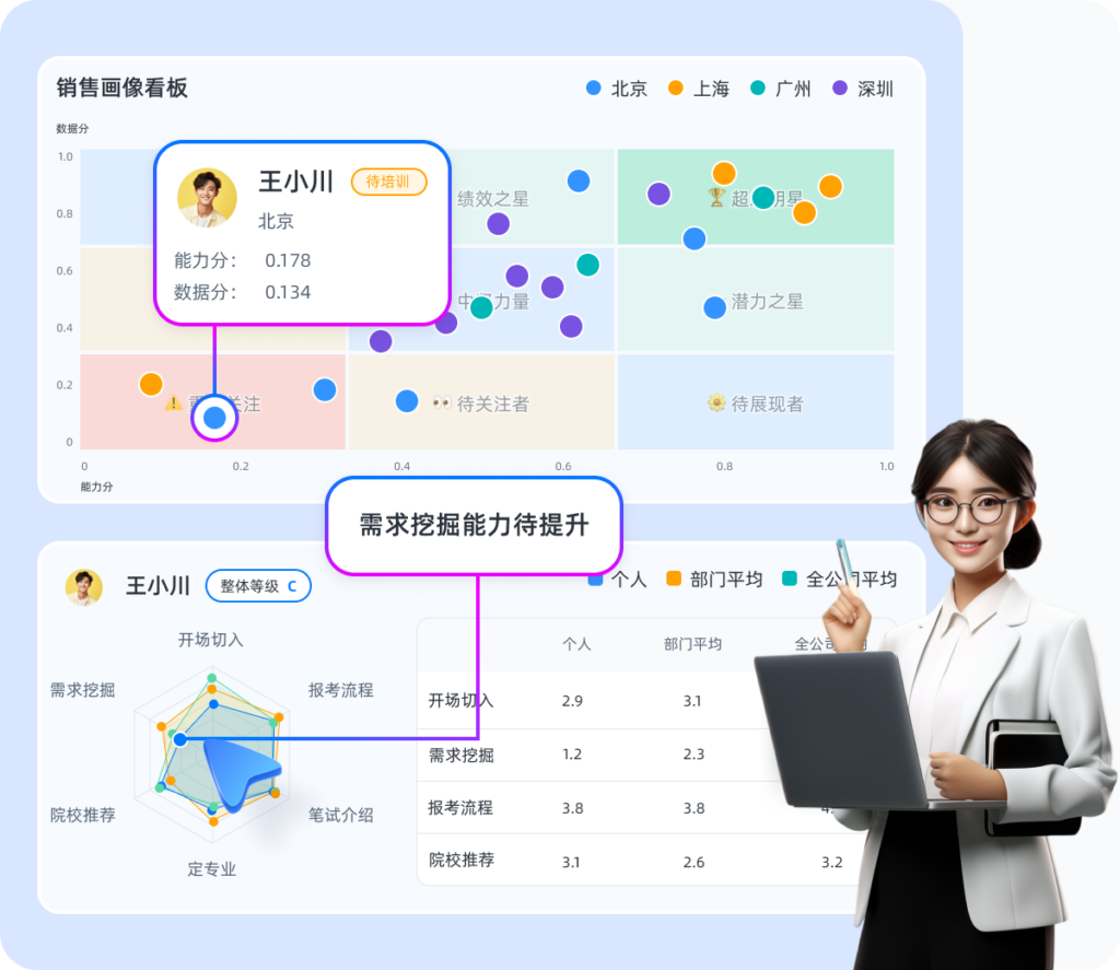 AI大模型的出现,为语音质检带来了革命性的变化。它能够快速处理海量的语音数据,通过自然语言处理技术,将语音转化为文本,再进行深度分析。这不仅大大提高了质检的效率,还能够实现对每一次通话的全面覆盖。更重要的是,AI大模型可以精准地识别出客户的情绪、需求和痛点,帮助我们更好地理解客户,从而优化销售策略。在销售过程中,客户的每一个反馈都可能蕴含着重要的信息。AI大模型能够通过对语音数据的智能分析,快速捕捉到客户的关键需求。比如,当客户在通话中提到对课程内容的疑虑时,AI大模型可以迅速识别并标记出来,提醒销售人员及时解答客户的疑问。这种智能分析能力,让我们能够在第一时间满足客户的需求,增强客户对我们的信任感。
