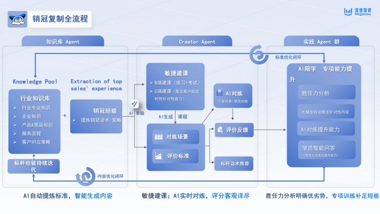 当前,在两票制、集采、医药代表备案制等政策的多重驱动下,医药营销正经历颠覆性变革。医药代表的角色从 “带金销售” 转向 “学术推广与技术咨询”,专业能力与合规意识成为药企核心竞争力。与此同时,医药营销领域正面临知识密度、合规复杂度、客户专业度的三重爆炸:产品信息、临床指南、循证数据等知识量急剧增长,代表沟通的每一个环节都存在合规风险,而临床医生的专业判断能力与时间成本意识也持续提升。面对行业变局,传统 “培训 + 师徒制 + 经理盯过程” 的模式已无法满足医药营销数智化转型的要求,能力不可复制、风险不可控、组织效率受限等痛点,成为制约药企营销升级的核心瓶颈。 在此背景下,深维智信提出打造 “专业、合规、实战、可迭代” 的超级代表,并通过 AI 技术实现能力的规模化复制。作为国内首家将人工智能大模型应用于销售和培训领域的 AI 原生应用公司,深维智信构建的AI 进化系统,以Megaview AI 陪练平台为载体,形成 “AI 智能萃取、AI 智能对练、AI 智能评估、数据沉淀与组织赋能” 的四大核心能力闭环,为药企营销组织升级提供全流程解决方案。