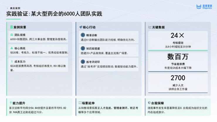 某大型药企6000 人销售团队真实案例验证,印证了 AI 进化系统的显著价值。目前该系统已从销售场景,延伸至人才选拔、管理者测评、转正考核等多个领域,让合规成为组织文化的内在组成部分。